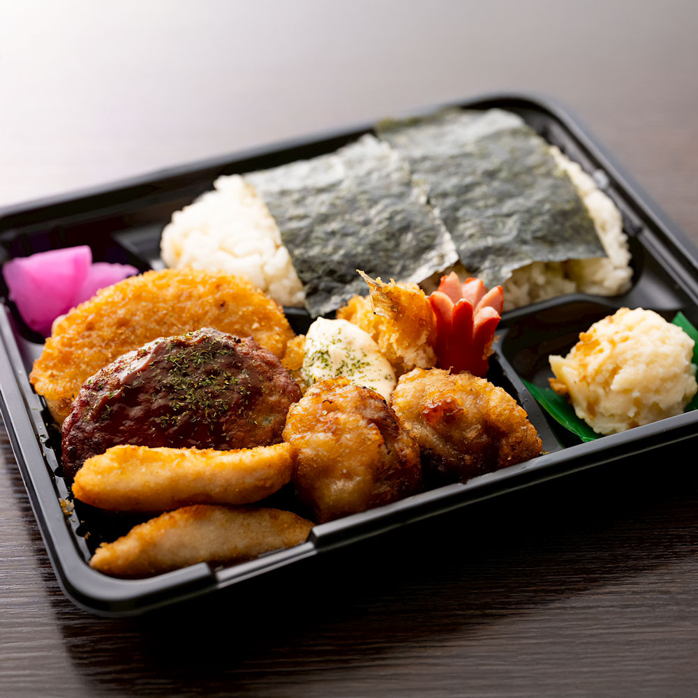 海苔のせご飯に、から揚げ、スティックフライ、ハンバーグ、ソーセージ、ポテトサラダ、漬物をぎゅっと。いろいろ楽しめるお茶付き弁当。